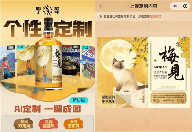 瓶子星球也与火山引擎展开合作,推出了“梅见”、“江小白”品牌的个性化AI定制酒。用户都能够上传图片DIY定制酒标,选择多种生动精美的图片风格,并附上祝福语,这种互动方式更符合抖音上年轻花钱的那群人的喜好。
